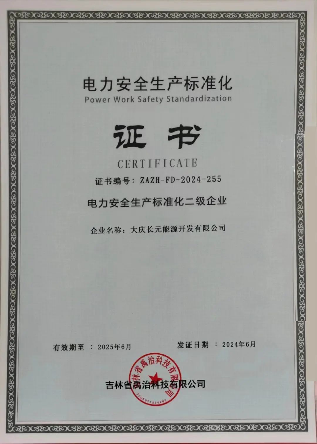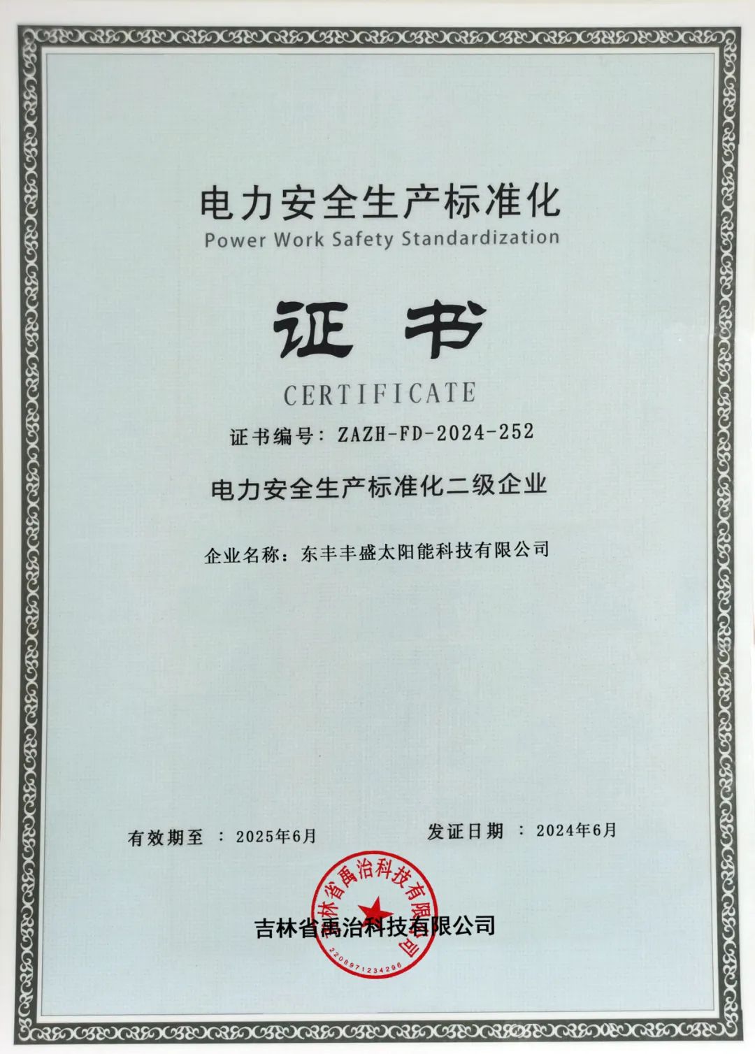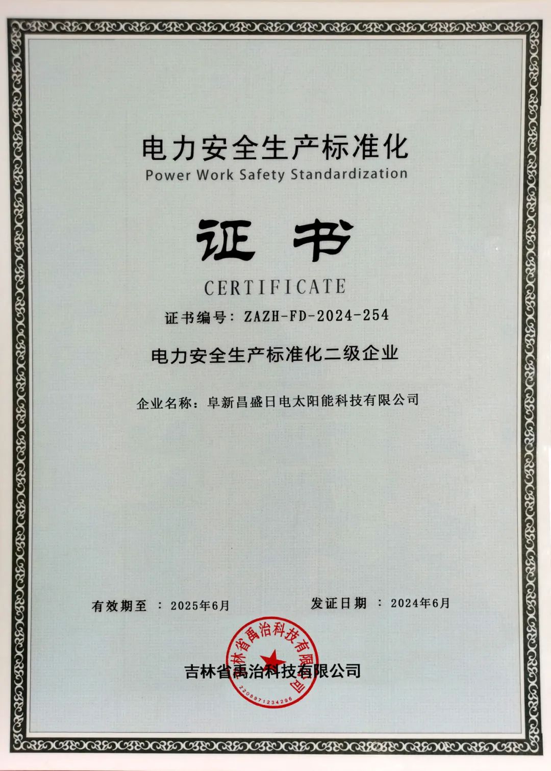 (圖為下屬項(xiàng)目公司電力安全生產(chǎn)標(biāo)準(zhǔn)化二級(jí)證書)