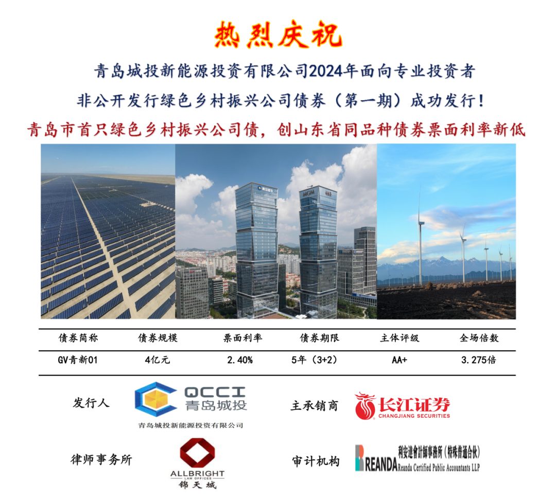 7月19日,青島城投新能源集團(tuán)成功以自身主體評級AA+、無擔(dān)保方式發(fā)行公司債券(GV青新01)。本期債券發(fā)行規(guī)模4億元,為青島市首只綠色鄉(xiāng)村振興公司債券,發(fā)行期限3+2年。本期債券發(fā)行共吸引了24家投資機(jī)構(gòu),全場認(rèn)購倍數(shù)達(dá)3.275倍,票面利率2.4%,創(chuàng)山東省同品種債券利率新低。