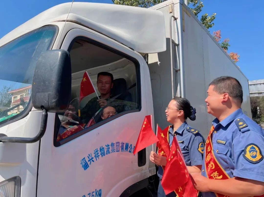 (工作人員與司機(jī)進(jìn)行國(guó)慶主題互動(dòng))