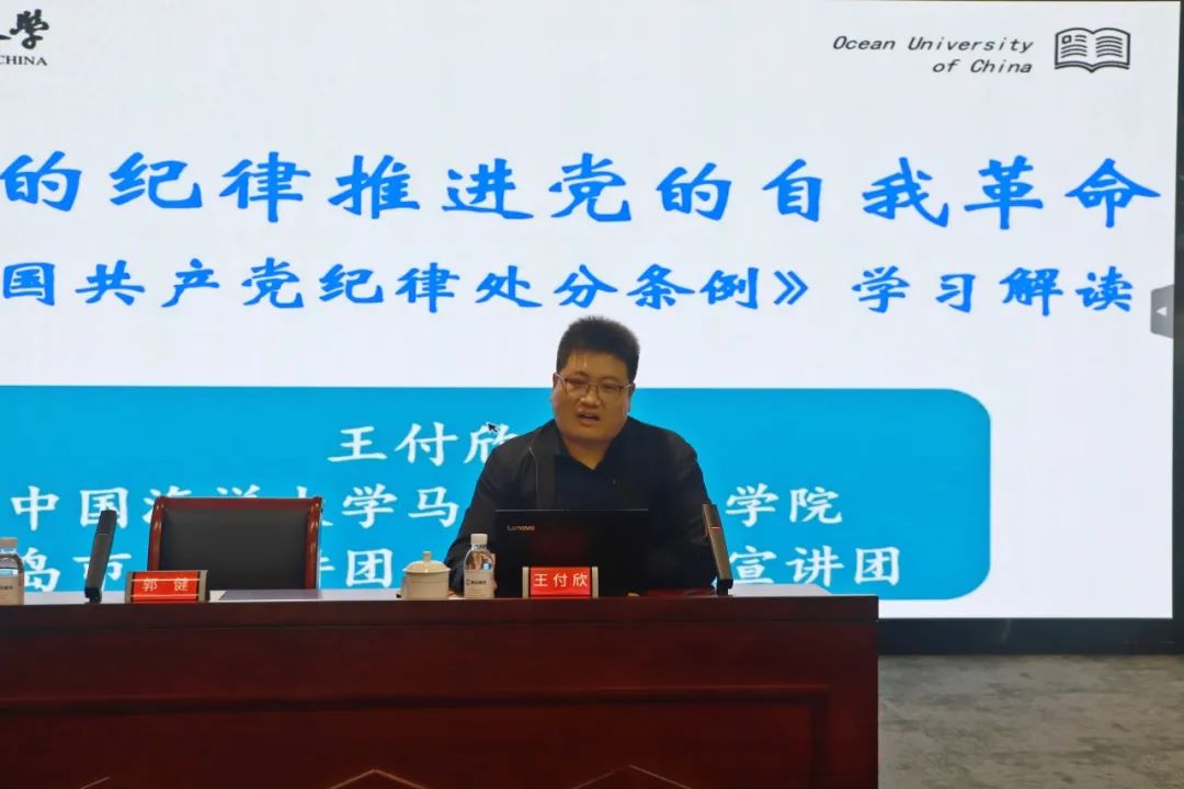 會議邀請中國海洋大學馬克思主義學院黨委副書記、副院長王付欣教授圍繞“學《條例》守黨紀、以嚴明的紀律推進黨的自我革命”主題作輔導報告。報告緊扣黨中央關于黨的紀律建設的總體要求,將習近平總書記關于黨的紀律建設的重要講話、重要指示精神與《條例》貫通起來解讀,結合黨史學習教育,聯系世情、國情、黨情,深入闡釋了開展黨紀學習教育的重大意義、新修訂《條例》的原則理念和主旨要義,并對《條例》的突出特點和重點內容進行了梳理分析,引導黨員干部準確全面把握《條例》的豐富內涵和實踐要求,更好地學紀、知紀、明紀、守紀。