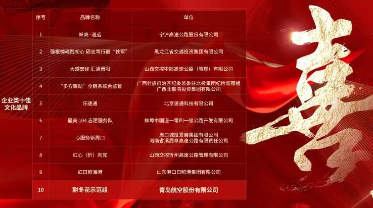 喜報!青島航空榮獲第七屆交通運輸優秀文化品牌“十佳”稱號