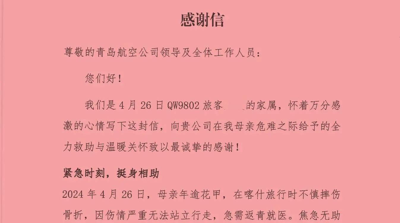 近日,一封含“贊”量滿滿的感謝信被專程送到了青島城投集團旗下青島航空的值機柜臺。信中,旅客家屬用“雪中送炭的人間大愛”形容這段跨越千里的護航之旅,字里行間流淌的真情,讓這封不足千字的信件成為青島航空真情服務的最佳見證。(圖為乘客發來感謝信)4月26日,年逾花甲的旅客萬女士在喀什旅行時不慎摔傷骨折,因傷情嚴重無法站立行走,需搭乘青島航空QW9802航班返青就醫,家屬在焦急無助之際聯系青島航空求助。接到旅客求