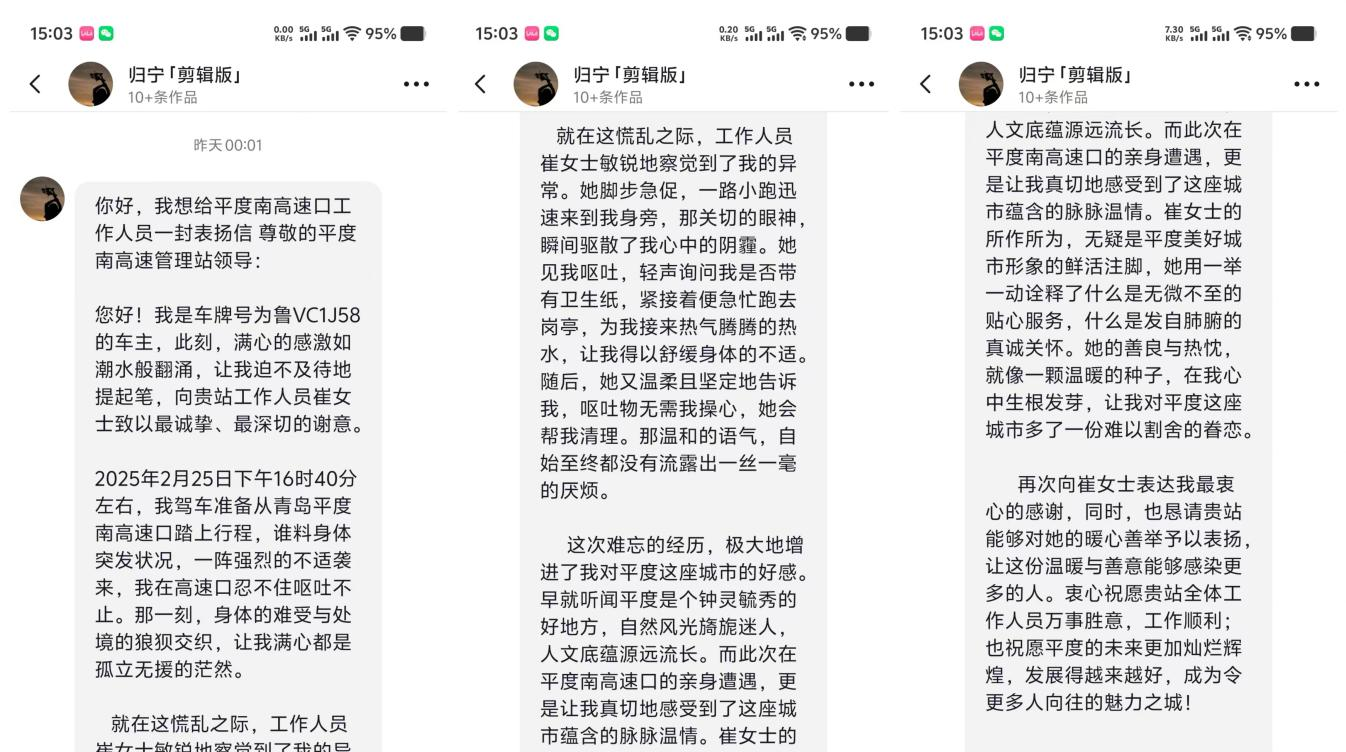 近日,一封通過抖音私信輾轉傳遞的感謝信,讓青島城投集團旗下青島高速集團平度收費站收費班長崔倩倩的暖心故事走入公眾視野。平度市文旅局官方賬號收到司乘人員特別致謝,信中記錄的溫情時刻,成為展現城市文明與青島高速服務品質的生動縮影。(圖為感謝信原文內容)2025年2月25日下午,一位車主行駛到平度收費站時身體突發不適,嘔吐不止。崔倩倩發現異常后,迅速遞上溫水關切地詢問車主狀況,幫助舒緩身體不適,并主動清理現場