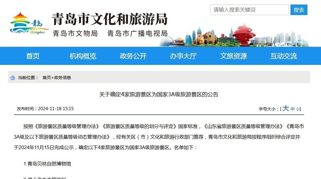 11月18日,青島市文化和旅游局正式發(fā)布《關(guān)于確定4家旅游景區(qū)為國家3A級旅游景區(qū)的公告》,青島城投集團投資建設的青島·上合之珠國際博覽中心成功獲評為國家3A級旅游景區(qū)。(圖為青島市文旅局網(wǎng)站截圖)青島·上合之珠國際博覽中心項目是城投集團匹配省市兩級重大部署和城市發(fā)展戰(zhàn)略,是山東省和青島市在更大范圍、更寬領(lǐng)域、更深層次推動上合組織及“一帶一路”沿線國家間雙多邊資本、技術(shù)、人才深度交融的重要平臺,是集“展、