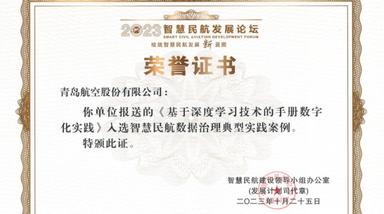 近日,2023年智慧民航發展論壇在北京舉辦,青島城投旗下青島航空獲得民航局頒發的“智慧民航典型案例”榮譽證書,成為此次評選航空運輸單位入選的10個案例之一。這是繼2022年度民航數據共享數字化能力指數(DCI)排名第一后,青島航空的信息化建設工作再次獲得我國民航業權威獎項 。(圖為榮譽證書)近年來,青島航空充分發揮城投集團產業協同優勢,與集團旗下數字科技公司密切聯動,數字化轉型工作成果卓著。此次獲獎,青島航空結