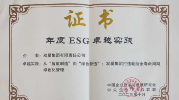 10月22日,“ESG中國論壇創新年會”在北京召開,中國ESG企業社會責任發布活動同時舉辦,并發布了《年度ESG卓越實踐報告》,集中展示了在ESG領域表現突出的30個卓越案例。雙星集團憑借踐行ESG治理、創造ESG價值、建設ESG生態,以《從“智能制造”向“綠色制造”:雙星集團打造輪胎全壽命周期綠色化管理》案例與中石化、國家電網、中國移動等企業共同入選,成為輪胎行業唯一入選企業。(圖為獲獎證書)ESG是指環境、社會、公司治理
