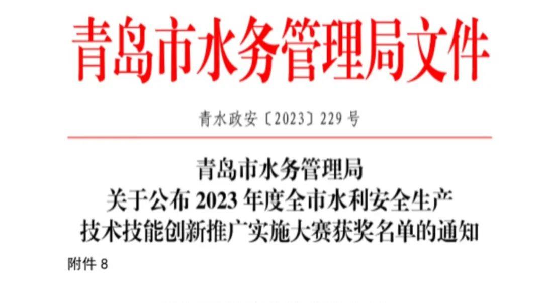 近日,青島市水務管理局印發《關于公布2023年度全市水利安全生產技術技能創新推廣實施大賽獲獎名單的通知》,青島城投集團官路水庫公司榮獲“2023年度全市水利安全生產技術技能創新推廣實施大賽特別貢獻獎”。(圖為部分獲獎名單)水利安全生產技術技能創新推廣實施大賽是深入貫徹落實習近平總書記“十六字”治水思路和關于治水興水重要講話批示指示精神的具體舉措;是推動《山東省黃河流域生態保護和高質量發展規劃》全面實施、