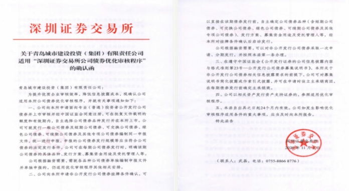 深圳證券交易所日前確認集團“優質發行人”資質,適用《深圳證券交易所公司債券優化審核程序》。集團積極響應青深兩地合作,作為青島市唯一一家在深交所具備“優質發行人”資質的企業,充分體現了資本市場對集團優良的主體資質和雄厚的企業實力的高度認可。不僅提升了集團在資本市場的影響力,更有效拓寬了集團融資渠道,也為后續優質低成本資金募集及多元化融資奠定了基礎。