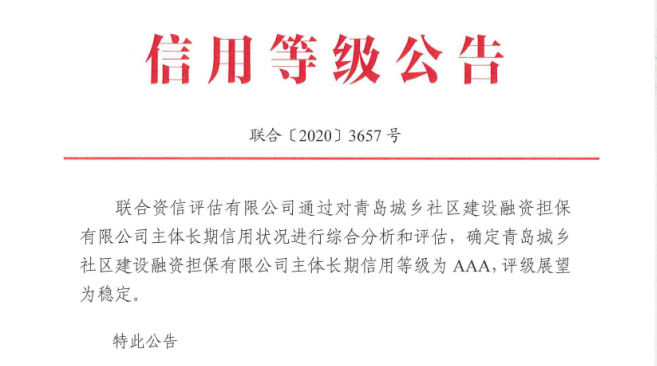 9月17日,聯合資信評估有限公司(下稱“聯合資信”)發布信用等級公告(聯合〔2020〕3657號),通過對青島城鄉社區建設融資擔保有限公司(下稱“城鄉擔保”)主體長期信用狀況進行綜合分析和評估,確定公司主體長期信用等級為AAA,評級展望為穩定。金控集團城鄉擔保公司成為目前山東省首家AAA融資擔保機構。