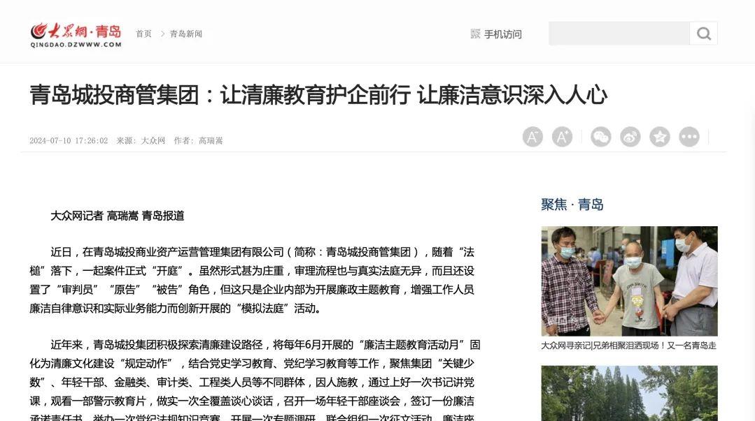 MORE +近日,在青岛城投商业资产运营管理集团有限公司,随着“法槌”落下,一起案件正式“开庭”。虽然形式甚为庄重,审理流程也与真实法庭无异,而且还设置了“审判员”“原告”“被告”角色,但这只是企业内部为开展廉政主题教育,增强工作人员廉洁自律意识和实际业务能力而创新开展的“模拟法庭”活动。